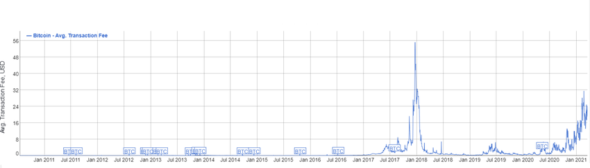 Z tego historycznego wykresu średnich opłat transakcyjnych BTC widzimy, że pozagiełdowe transakcje kryptowalutowe zyskały na popularności w ciągu ostatniego roku. W końcu tylko transakcje o wysokim wolumenie, głównie instytucjonalnych graczy mogłyby ponieść tak wysokie opłaty.