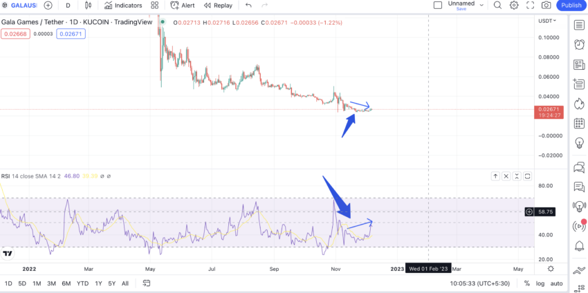 Zauważalny jest również pozytywny i poruszający się w górę wskaźnik RSI. Zgodnie z tym, GALA tworzy wyższy szczyt. Dywergencja bycza jest widoczna, jeśli utworzymy ścieżkę na wykresie ceny i RSI.