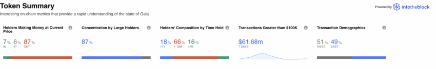 Jednak na razie nie wygląda to najlepiej. Na dzień dzisiejszy jedynie 7% posiadaczy GALA jest w zysku. Natomiast, tylko 18% posiadaczy tokenów trzyma GALA od ponad roku. Dodatkowo, 100 największych posiadaczy GALA ma 85,69% podaży w obiegu.