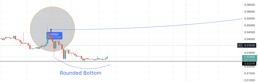 Ponieważ przewidujemy wzór lustrzanego odbicia, najbliższym punktem do replikacji jest punkt F. Wiemy, że spadek z punktu E do punktu F wyniósł 40%. Więc we wzorze lustrzanym oznaczałoby to zysk o 67%. W związku z tym, GALA może mieć w zasięgu ręki maksimum na poziomie 0,07928 USD.