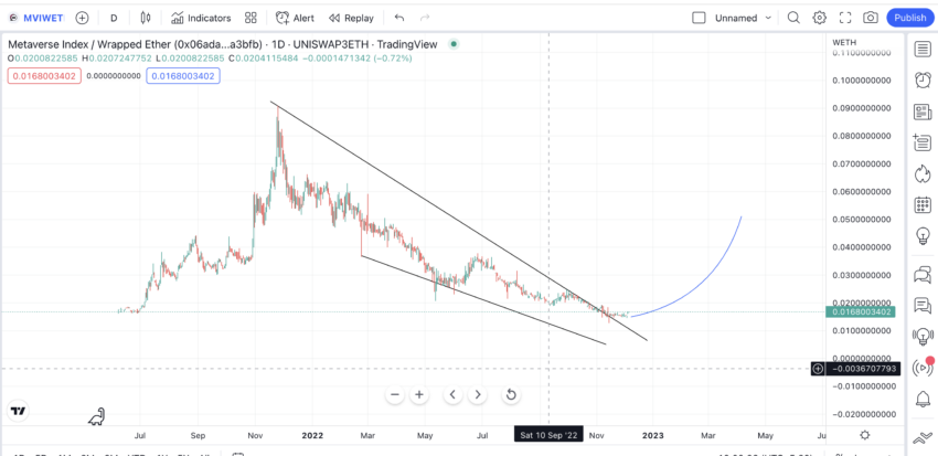 Oto para Metaverse Index – wETH na Uniswapie. Widać spadek oraz możliwe wybicie przy górnej linii trendu. Jeśli ta formacja się utrzyma, kurs GALA powinien pozostać wierny swojej prognozie.
