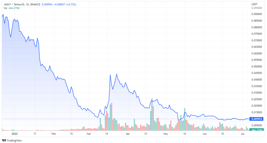 Maksymalna ilość JASMY wynosi 50 miliardów, natomiast podaż w obiegu wynosi 4,75 miliarda. W chwili pisania tego tekstu, Jasmy jest notowany po 0,0095$, a jego kapitalizacja rynkowa wynosi ok. 45 milionów dolarów.