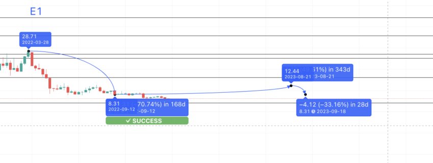 Korzystając ze wzorów i danych, kolejny punkt, czyli M1, może zjawić się za 127 dni przy spadku 71,05% w stosunku do E1. Odległość ta może wynosić od 127 do 609 dni (według zestawu danych 1). Teraz, jeśli narysujemy linię prognozy od E1, zobaczymy dołek przy 8,40 USD. Również jest to spełnienie prognozy NEO, wskazujące, że zmierzamy we właściwym kierunku.
