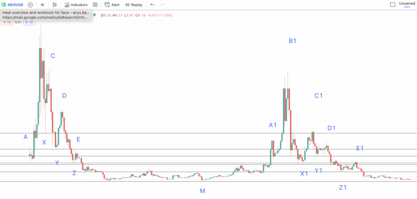 Wykorzystanie analizy technicznej może pozwolić nam znaleźć przyszłą cenę tokenów NEO w krótkim, a nawet w długim terminie. Oto wykres tygodniowy, który wykorzystamy do identyfikacji wzoru: