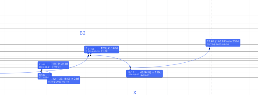 Teraz kolejnym punktem po X2 może być C2. W przypadku poziomów cenowych musimy odwołać się do powyższych zestawów danych. Średni wzrost stanowi 146,45%. Odległość od X2 może się zmieniać, w zależności od stanu rynku kryptowalut. Podczas gdy spodziewamy się tego najprędzej w 2024 roku, ospałość rynku może przesunąć to do 2025 roku.