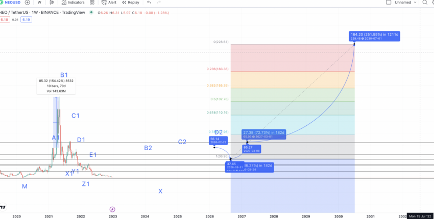 Ale B2, C2 i D2 utworzyłyby w tym momencie wyższy szczyt, pokonując istniejący trend spadkowy. W związku z tym dołek w 2026 roku może sięgnąć nawet 35,86 USD, co jednocześnie będzie silnym poziomem wsparcia dla kryptowaluty NEO. To spadek o zaledwie 36%. Możemy to oznaczyć jako Z2.