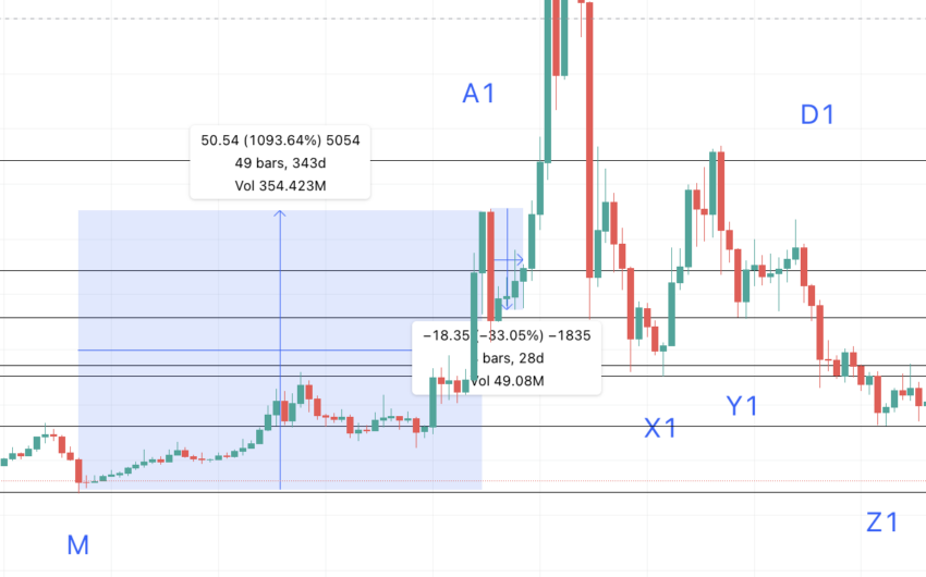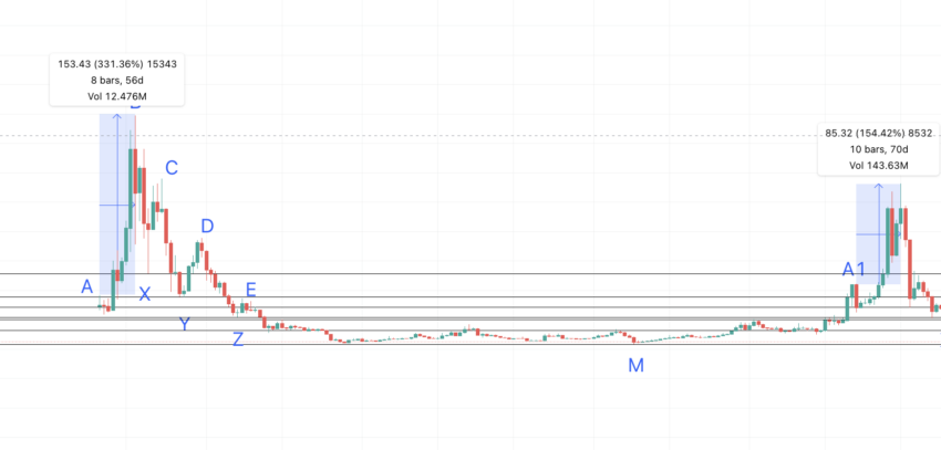 A do B = 56 dni i 336,83%; B do X = 21 dni i -67,49%; X do C = 21 dni i 124,28%; C do Y = 35 dni i -70,18%; Y do D = 28 dni i 116,4%; D do Z = 56 dni i -71,58%; Z do E= 7 dni i 61,64%; E do M = 609 dni i -89,34%.