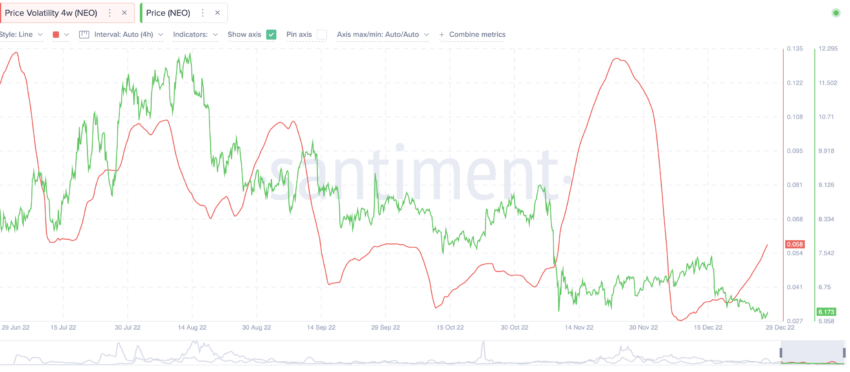 Zwróć uwagę, że 4-tygodniowa zmienność NEO gwałtownie wzrosła od połowy listopada 2022 do początku grudnia, co spowodowało spadek kursu. Gdy zmienność osiągnęła minimum, kurs zaczął ponownie piąć się w górę. Jednak zmienność powoli zwiększa się, co może spowodować krótkoterminowy spadek.