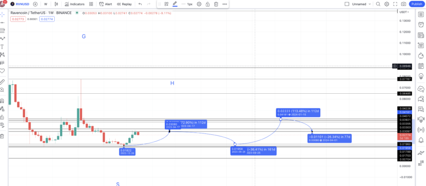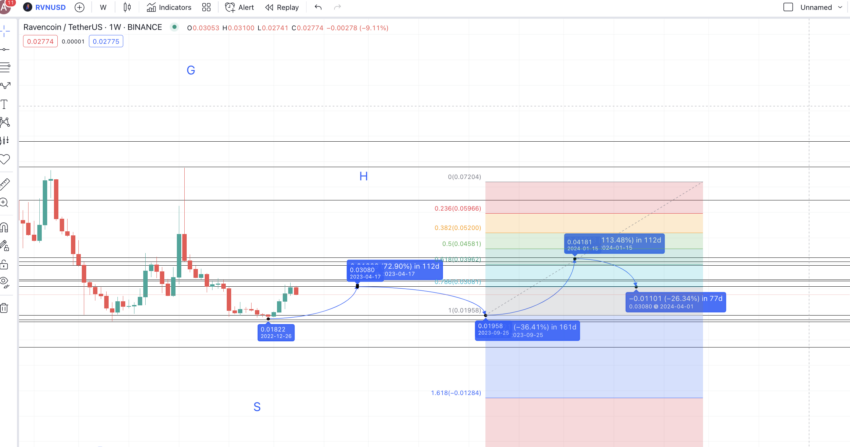 Ostatni dołek mamy przy S. Biorąc pod uwagę obecne warunki rynkowe, możemy oczekiwać, że RVN w ciągu 112 dni zajdzie o 71.79% wyżej. To stawia prognozowany kurs Ravencoin na 2023 rok na poziomie 0,03151 USD blisko kwietnia.