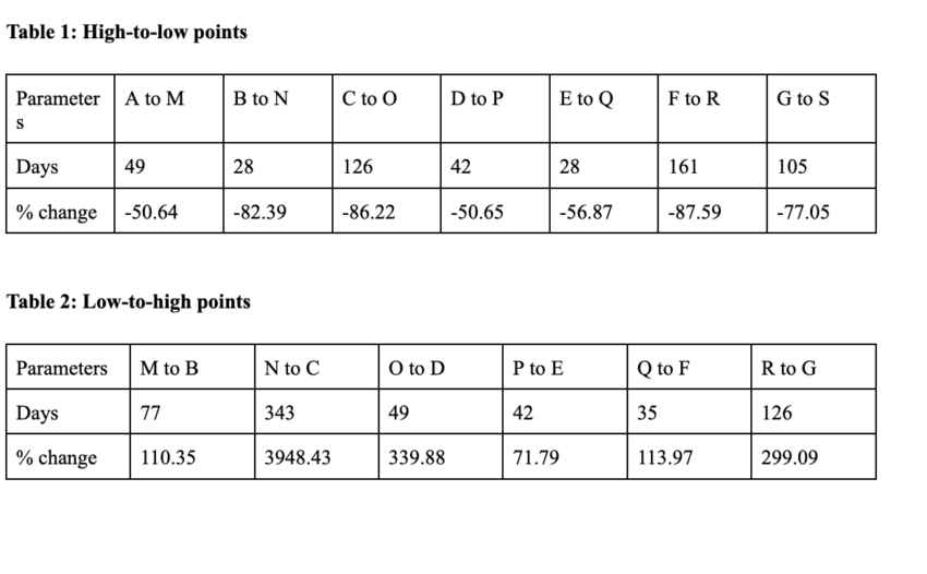 Podobnie, średnie wartości od dołków do szczytów wynoszą 828,43% i 112 dni. W przypadku niedźwiedzich warunków rynkowych, maksymalny wzrost może wynosić 71,79%, zgodnie z tabelą 2. Natomiast maksymalna liczba dni dla tego samego lub jakiegokolwiek innego procentu wzrostu może wynosić 343 dni.