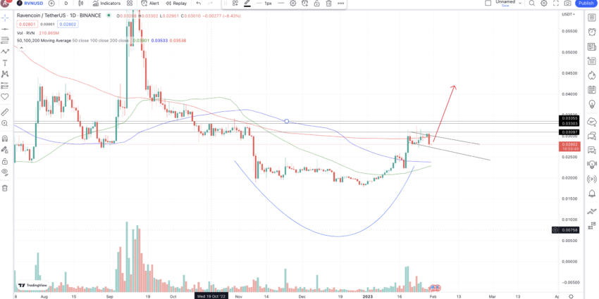 Zanim przejdziemy do długoterminowej prognozy kursu Ravencoin, oto wykres dzienny dla Twojego odniesienia. Obecny kurs RVN na poziomie 0,028 USD musi naruszyć górną linię trendu, aby skalować wyżej, odpowiednio w kierunku 0,0330 USD i 0,03355 USD.