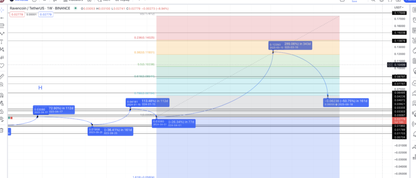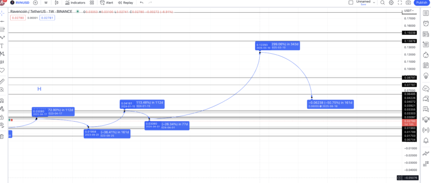 Ogólnie rzecz biorąc, dodatkowe metryki wskazują na pewną konsolidację kursu Ravencoin. To prowadzi nas do analizy technicznej.