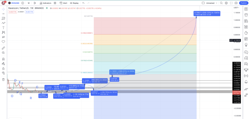 Jeśli prześledzimy ścieżkę wzrostu z wykorzystaniem tego samego nachylenia, możemy spodziewać się, że kurs RVN w 2030 roku sięgnie nawet 1,036 USD.
