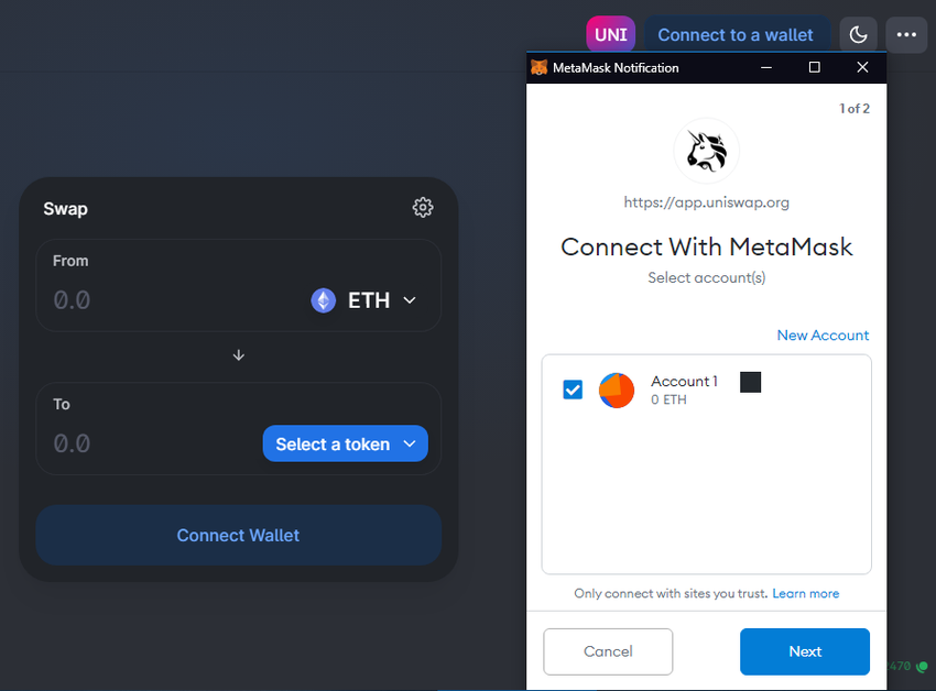 Po przejściu do Uniswap, zobaczysz “Podłącz portfel (Connect to a wallet)” w prawym górnym rogu.