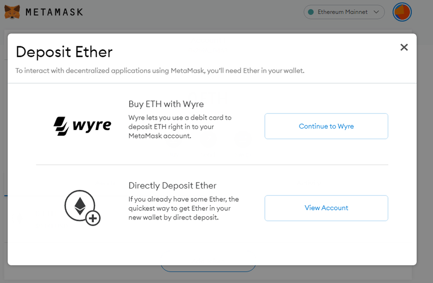 Jednak przed rozpoczęciem wymiany tokenów lub czegokolwiek innego z portfelem MetaMask, musisz mieć fundusze. Oznacza to, że musisz najpierw przekonwertować walutę fiat na ETH. Portfel MetaMask daje dwie opcje – Wyre payment processor lub transfer za pomocą adresu blockchain.