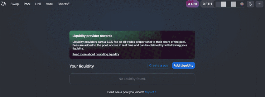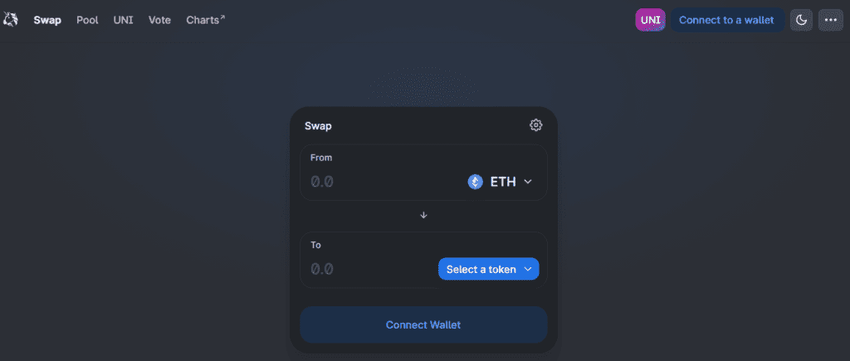 Pamiętaj, że dApps same w sobie są smart kontraktami działającymi na Ethereum (inne jak BSC, Cardano, czy Solana mają swoje własne dAppy). Poziomem bazowym dAppów jest ich interfejs internetowy. To jest to, co widzisz, kiedy łączysz się z Uniswap – jedną z najpopularniejszych zdecentralizowanych giełd używanych do yield farmingu.