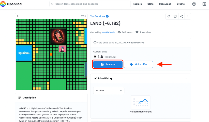 Aby kupić ziemię w The Sandbox, musisz wybrać działkę, którą chcesz kupić. Masz możliwość kupienia jej od razu i zapłacenia ceny proponowanej. Możesz też złożyć ofertę, jeśli chcesz zaoferować za nią mniej.