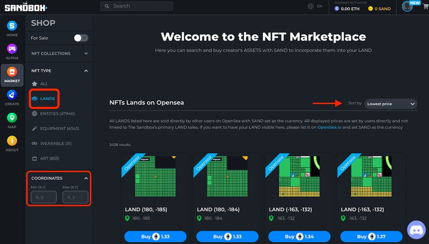 Tutaj znajduje się rynek The Sandbox. Jeśli szukasz ziemi z konkretnej lokalizacji, powinieneś użyć tego rynku, aby wyszukać współrzędne lub posortować listy.