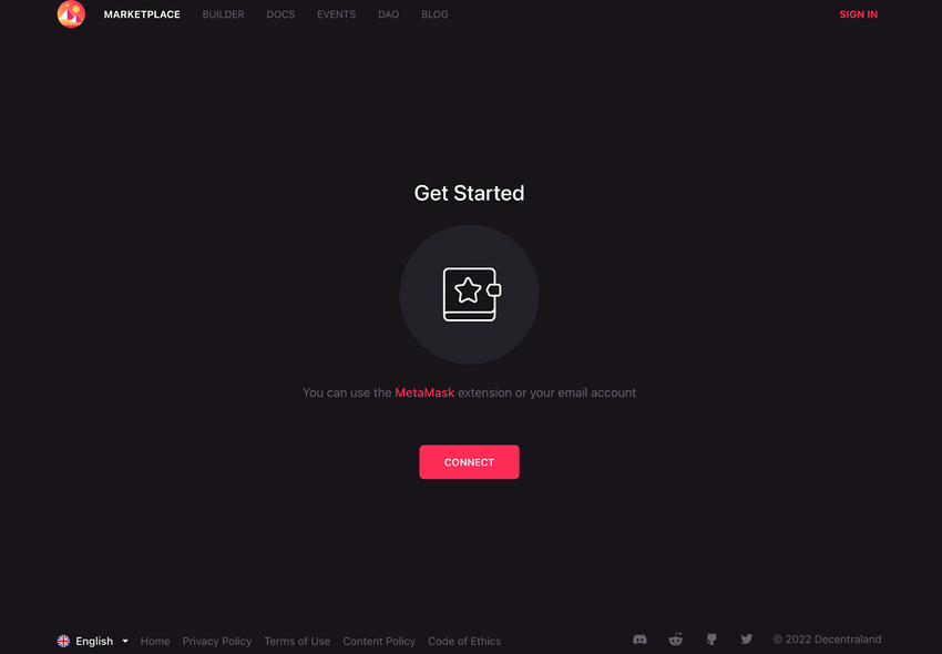 Przejdź do wybranego przez siebie rynku i podłącz swój portfel. My użyjemy rynku Decentraland, ale możesz również skorzystać z innych.