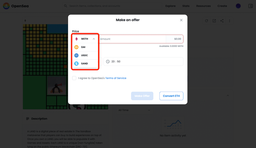 Jeśli chcesz złożyć ofertę, możesz zaproponować zapłatę w kilku walutach (wETH, DAI, USDC, SAND). Możesz również wybrać czas trwania Twojej oferty (1,3,7 dni, jeden miesiąc lub niestandardowa data).
