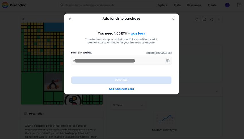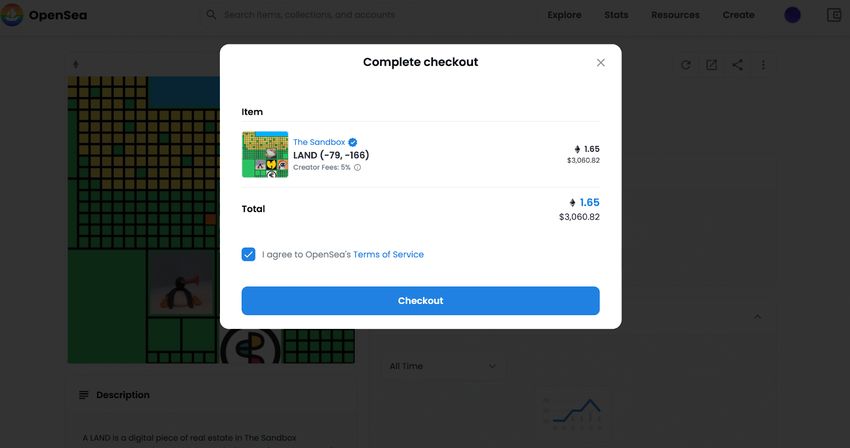 Jeśli chcesz natychmiast kupić ziemię metaverse w The Sandbox, będziesz musiał znaleźć ofertę, która oferuje opcję “Kup teraz“. Zobaczysz wtedy całkowitą kwotę, jaką musisz zapłacić za zakup tej ziemi i będziesz mógł przejść do kasy.
