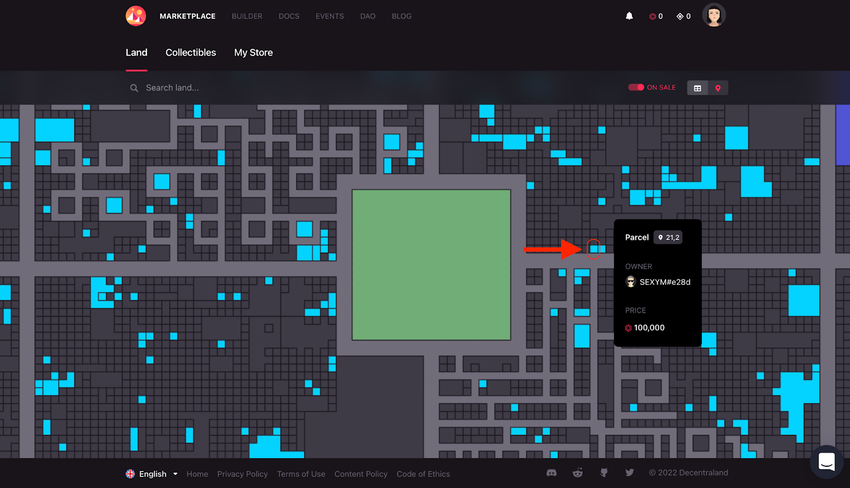Następnym krokiem jest analiza możliwości i wybór pożądanej nieruchomości metaverse. Gdy będziesz przeglądał mapę Decentraland, zwaną Atlasem, zobaczysz, że niektóre działki są na sprzedaż. Po najechaniu na nie zobaczysz właściciela i cenę. Ceny podane są w MANA.