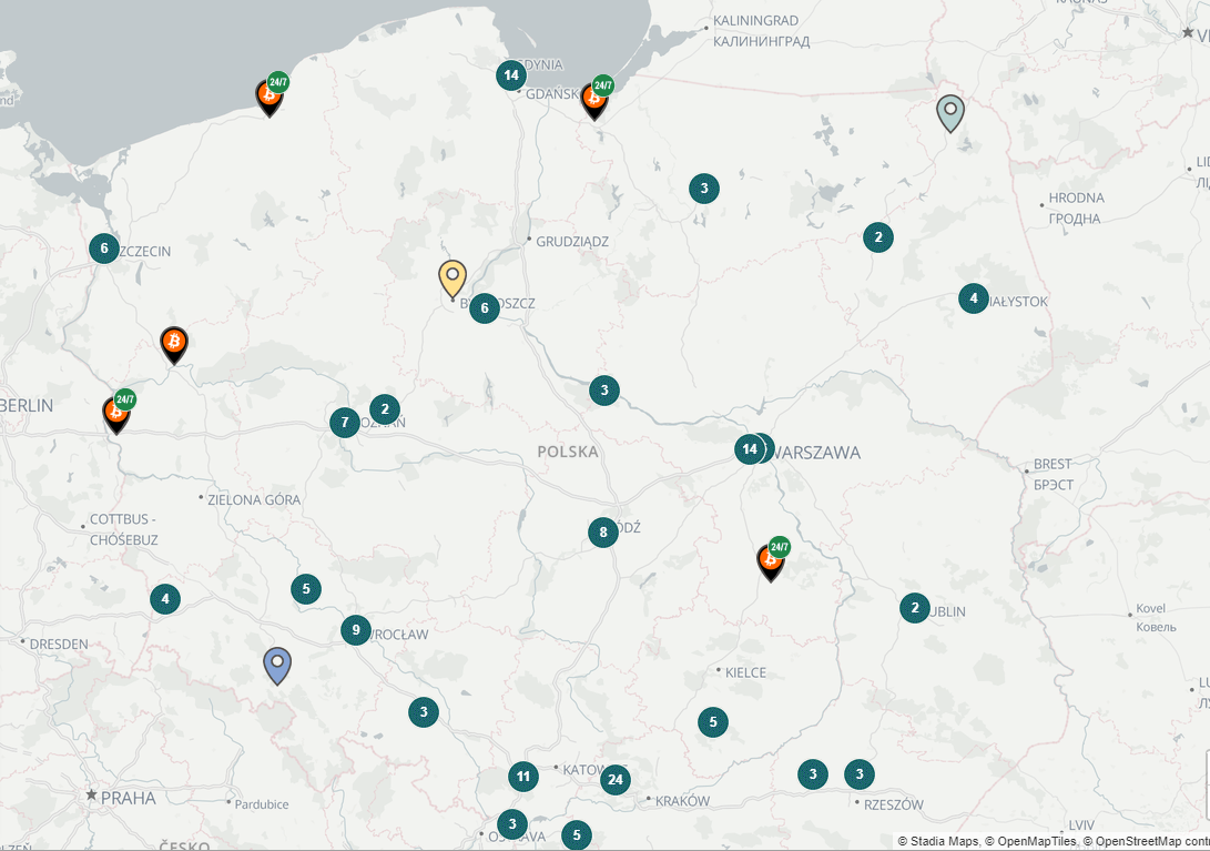Poniżej prezentujemy orientacyjną mapę lokalizacji bitomatów w Polsce. Jak widać, w każdym zakątku naszego kraju chętni entuzjaści znajdą miejsce, gdzie można wybrać się do kryptowalutowego bankomatu i kupić lub sprzedać Bitcoina i inne krypto. Dokładniejsze lokalizacje dostępne są pod tym linkiem.