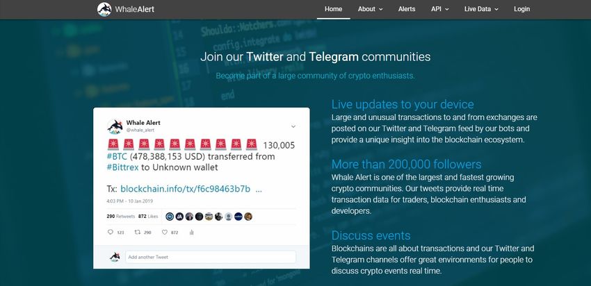 Whale Alert to usługa oparta na Twitterze, która informuje o każdej dużej transakcji, na wielu rodzajach blockchainów. Ta usługa okazała się bardzo przydatna, ponieważ ujawnia wiele transakcji na dużą skalę, często z identyfikacją portfeli nadawców/odbiorców co może dać społeczności danego projektu pogląd na to, dokąd może zmierzać projekt.