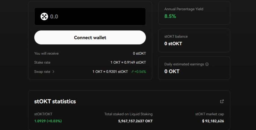 Platforma OKX oferuje płynną usługę stakingu w celu stakowania i zarabiania OKT na łańcuchu OKT. W zamian za stakowanie OKT, użytkownicy otrzymują pochodne tokeny stOKT. Jest to uniwersalny token w standardzie KIP-20, którym można handlować i wykorzystywać w ramach protokołu OKTC.