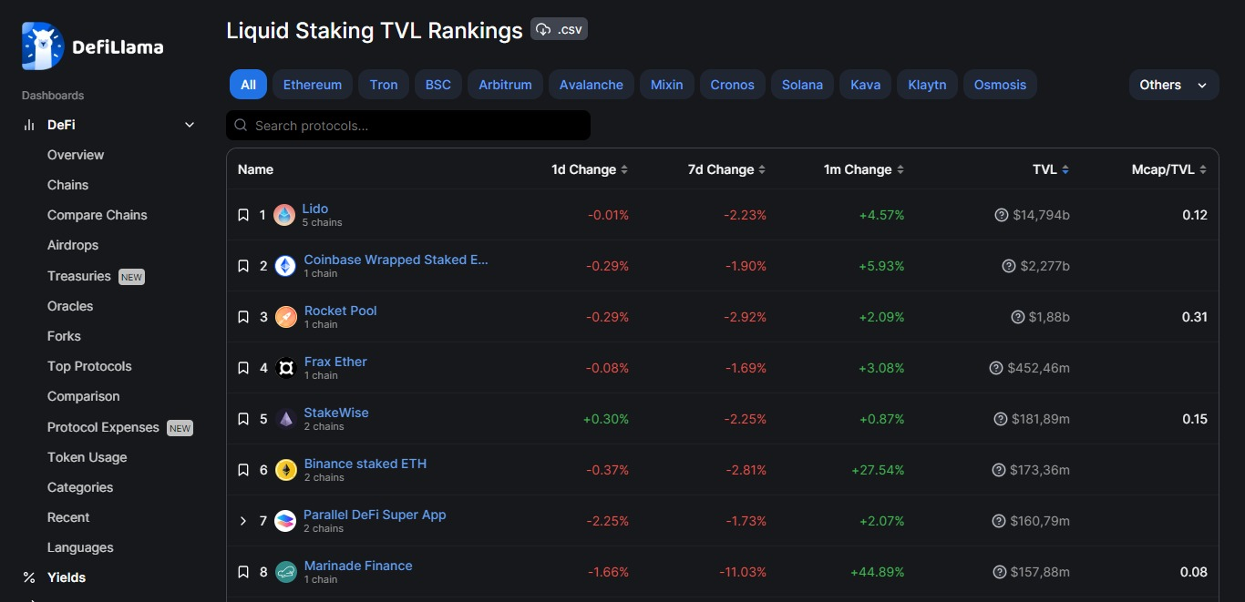 Rynek jest pełen płynnych protokołów stakingowych oferujących wiele opcji, a ich liczba stale rośnie. Blockchainy często oferują własne protokoły. Inne łańcuchy, takie jak Solana (SOL) i Polkadot (DOT), polegają na rozwiązaniach stron trzecich w zakresie płynnego stakingu. Poniżej prezentujemy rankingi TVL dla każdej z tych sieci.