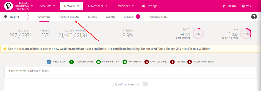 Po zakończeniu kliknij na Sieć, przejdź do opcji Polkadot Staking, a następnie wybierz opcję Account Actions.