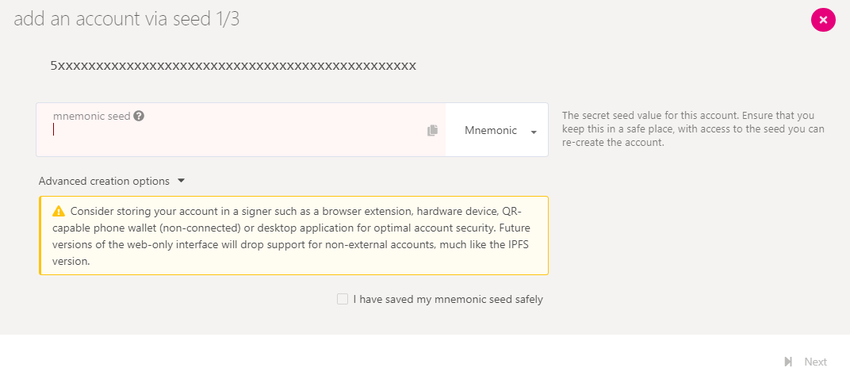 Kliknij na Dodaj konto i wpisz swoją frazę odzyskania z rozszerzenia Polkadot{.js}, którą wpisałeś wcześniej.