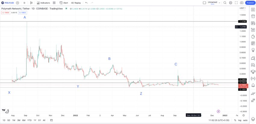 W 2023 roku 0,2015 USD może działać jako silne wsparcie. Następnie 0,1697 USD jest bardzo silnym poziomem wsparcia z wieloma punktami styku. Jeśli sieć Polymath nadal będzie sobie dobrze radzić, a mainnet Polymesh będzie się rozwijać, możemy oczekiwać, że w 2023 roku dołek osadzi się na 0,1697 USD. Pokonałoby to dotychczasowy trend.