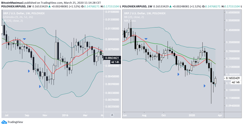 To nie jedyne podobieństwa między tymi dwoma cyklami. Chwilę przed dołkiem z 2015 r. 10- i 20-tygodniowe średnie kroczące (MA) wyznaczyły niedźwiedzi krzyż. Wkrótce potem cena zaczęła spadać, co trwało do momentu, gdy cena osiągnęła wspomniany wcześniej najniższy poziom. Ponadto XRP dwukrotnie spadł poniżej dolnej wstęgi Bollingera, w tym na “all time low”.