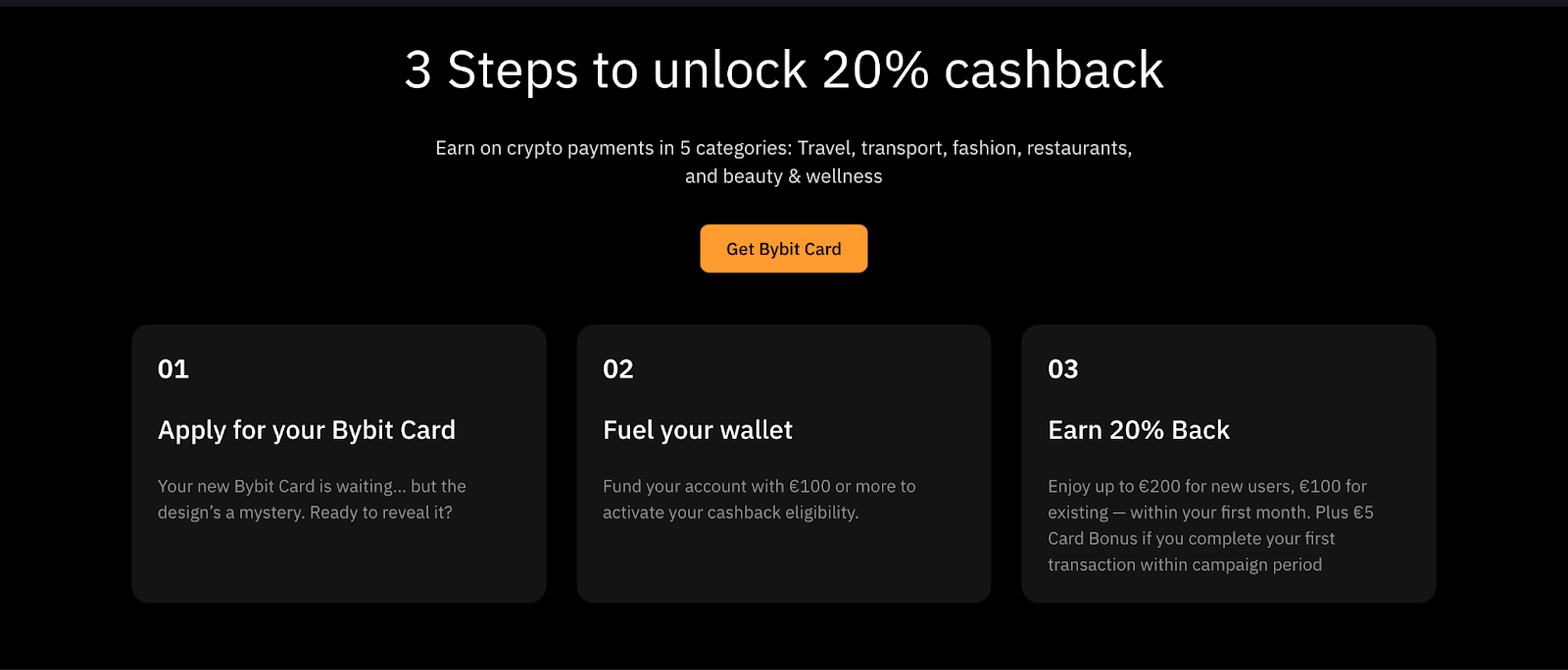 Posiadacze kart mogą doładowywać je w czasie rzeczywistym, przeglądać transakcje i zarządzać swoją kartą z pulpitu nawigacyjnego Bybit EU. Funkcje bezpieczeństwa obejmują natychmiastowe zamrażanie / odmrażanie i ochronę 2FA, a wszystko to zgodnie z zasadami przechowywania regulowanymi przez MiCAR.