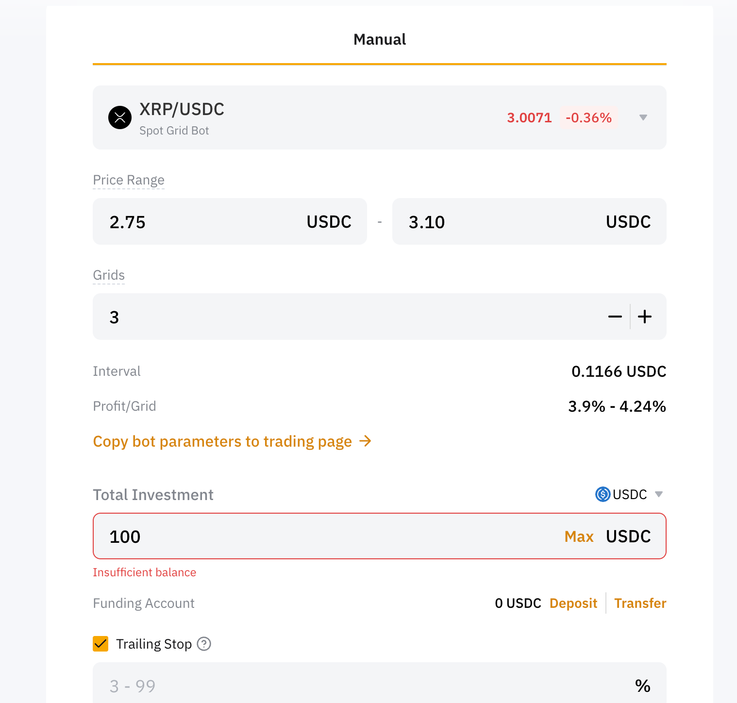 - Dostosuj zaawansowane opcje, takie jak Trailing Stop (aby pozwolić siatce automatycznie przesuwać się w górę wraz z rynkiem) lub dodaj limit Stop Loss lub Take Profit dla lepszej kontroli.