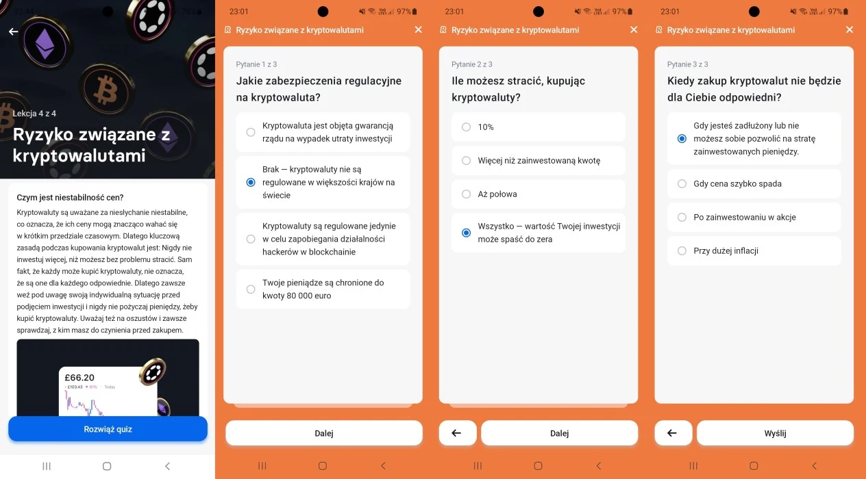 Jeśli chodzi o temat 1inch, Revolut przygotował aż 3 quizy. Za ich poprawne wykonanie można otrzymać tokeny 1inch o wartości 4,5 EUR.