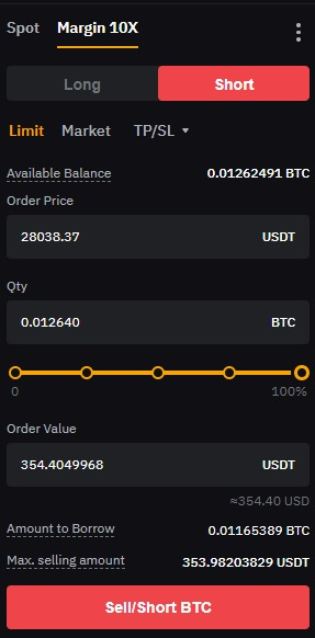Po wybraniu odpowiedniej pary zostaniesz przeniesiony do głównego pulpitu handlowego giełdy Bybit. Tam, oprócz wykresu cenowego oraz listy zleceń kupna i sprzedaży, zobaczysz po prawej stronie pole tworzenia nowego zlecenia. Wpisując odpowiednie wartości w dostępne pola ustalasz wielkość zlecenia i cenę, przy której ma zostać wykonane. Następnie wystarczy kliknąć przycisk na dole… i już! Short na Bitcoinie otwarty.