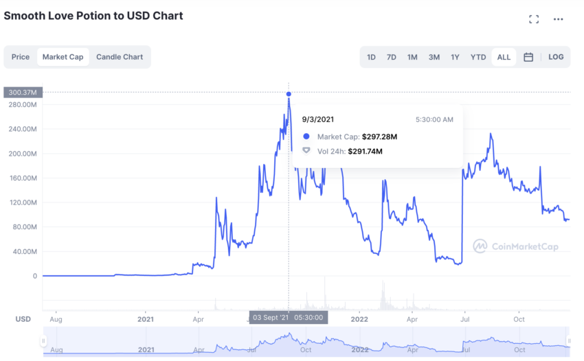 Kapitalizacja rynkowa Smooth Love Potion (SLP) osiągnęła szczyt w dniu 3 września 2021 roku, osiągając poziom 297,28 mln USD.