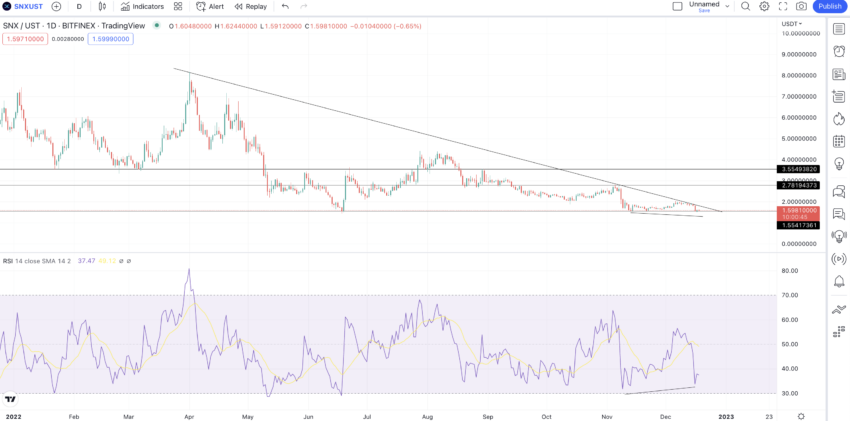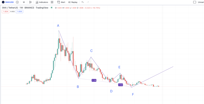 Szczyt dla poprzedniej iteracji znalazł się na poziomie 4.418 USD w dniu 1 sierpnia 2022 roku. Tak więc następny dołek może być przy 0.847 USD, ale cena SNX respektowała bezpośrednie wsparcie 1.57 USD. Oznacza to, że na SNX oddziaływują kluczowe linie wsparcia i oporu.