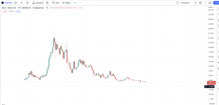 Ponieważ token SNX istnieje od 2020 roku, nawet wykres tygodniowy daje nam wiele punktów do wykreślenia przyszłych cen.