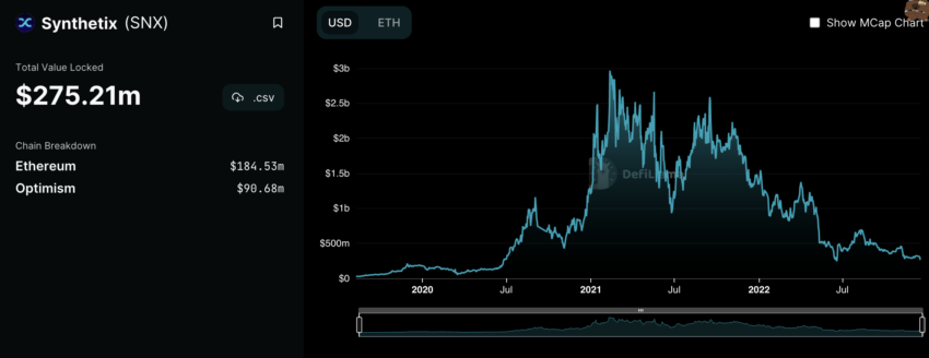 Również Synthetix ma całkiem solidną obecność w DeFi. Sieć zajmuje obecnie 2 miejsce pod względem TVL na Optimismie. Jednak jego wyniki miesiąc do miesiąca w DeFi nie były najlepsze, gdyż TVL spadł w międzyczasie o 10,25%.