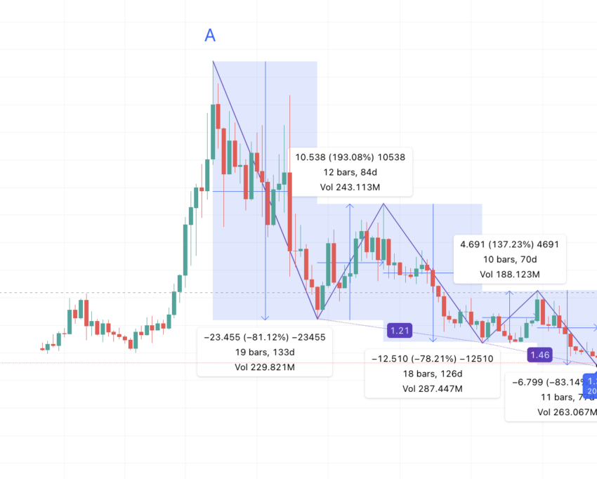 A do B = -81,12% i 133 dni; B do C = 193,08% i 84 dni; C do D = -78,21% i 126 dni; D do E = 123,88% i 70 dni; E do F = -83,14% i 77 dni.