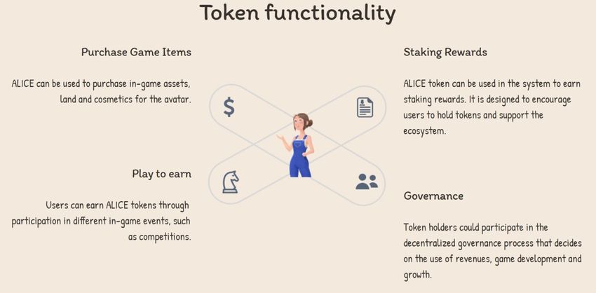 Użytkownicy kupują przedmioty w grze za pomocą tokena ALICE. Ponadto, mogą go używać na rynku NFT projektu i upiększać postacie w grze, pomimo innych funkcji.