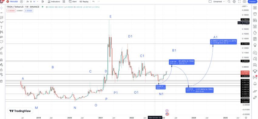 Ostatni dołek, czyli 0,0395 USD, może być w punkcie M1. Z tego poziomu spodziewamy się, że TRX wzrośnie o 216,06% (wcześniej obliczona średnia), ponieważ do 2024 roku rynek kryptowalut ma wykazywać oznaki hossy.