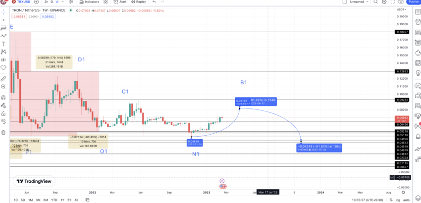 Poziom ten możemy oznaczyć jako B1. Następny dołek, czyli M1, może osiągnąć najniższy procent spadku 51,32%, gdyż pozytywna tygodniowa dywergencja RSI może zastopować spadek kursu TRX poniżej pewnego poziomu. Więc to stawia minimalny kurs TRX w 2023 roku na poziomie 0,0395 USD.
