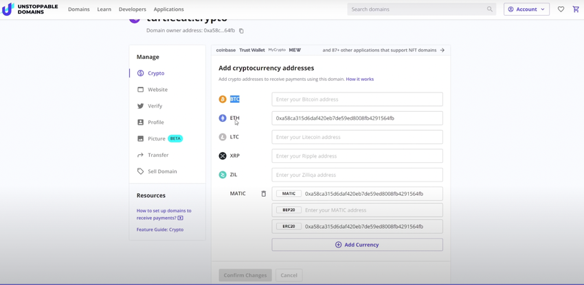 Teraz masz wszystko ustawione, a za każdym razem, gdy ktoś wyśle Ci którąś z tych monet, Unstoppable Domains będzie wiedziało, aby przekazać je do Twojego portfela.