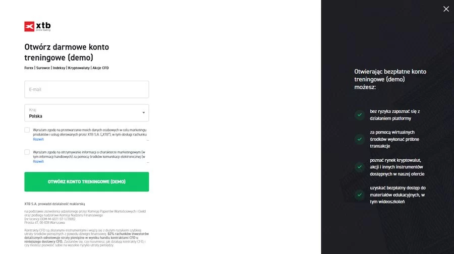 XTB daje także możliwość początkującym inwestorom praktykowania handlu bez ryzyka, zanim zaczną handlować samodzielnie prawdziwym kapitałem. Do tego służy konto demo XTB.