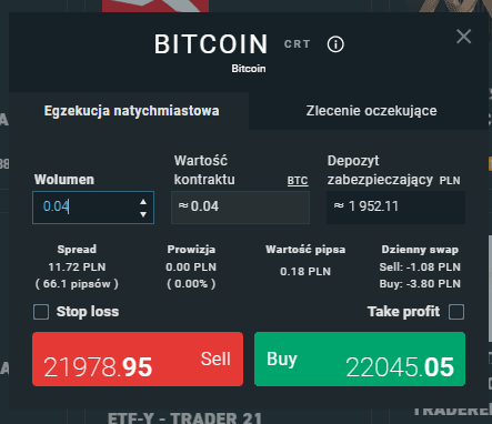 W przypadku handlu produktami CFD, przy zawieraniu transakcji naliczany jest spread. Podczas przetrzymywania pozycji przez noc może też wystąpić opłata SWAP.