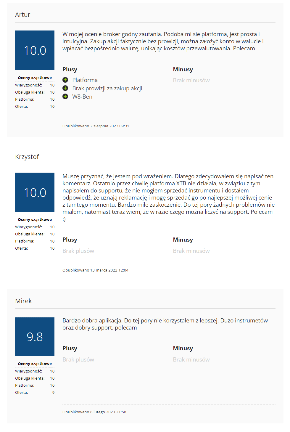TrustPilot również wskazuje, że opinia klientów XTB jest raczej pozytywna. Broker zebrał tam niemal 800 opinii, które przekładają się na średnią ocen 4,3/5. To naprawdę dobry wynik jeśli chodzi o brokera.